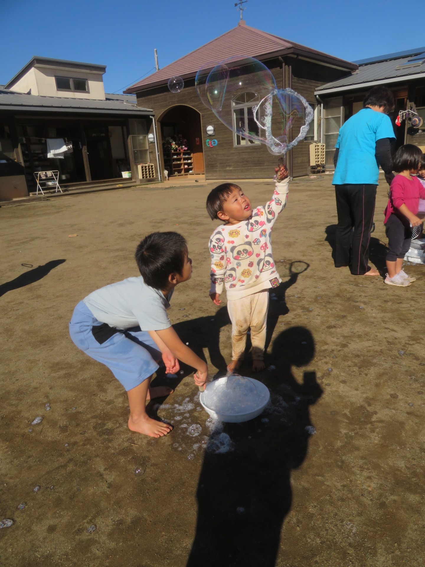 “くじら”や“ドラゴン”“大雪”などいろいろなシャボン玉を見せてもらいました。もちろんこどもたちもそれぞれ体験をして、キラキラ光るシャボン玉に大興奮の子どもたちでした!