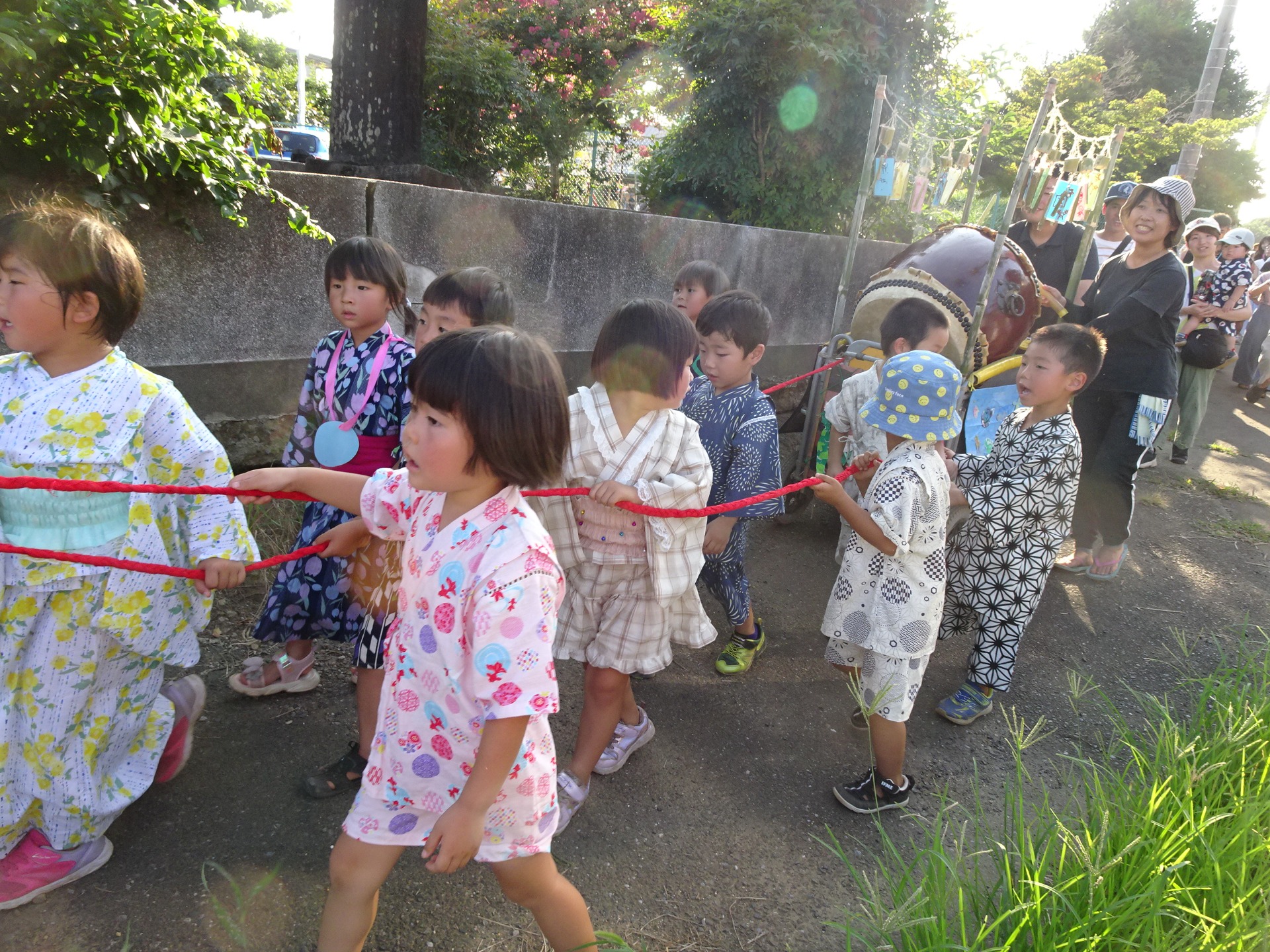 勇壮な年長さんの太鼓から始まりました。そして今年のお神輿のテーマは『かえるの豆太』。年長さんが元気に近所の神社まで担いでくれ、4歳児は手作りの竹風鈴を飾った山車をひいてくれました。盆踊りも保護者交えてとても盛り上がり楽しいひとときになりました。