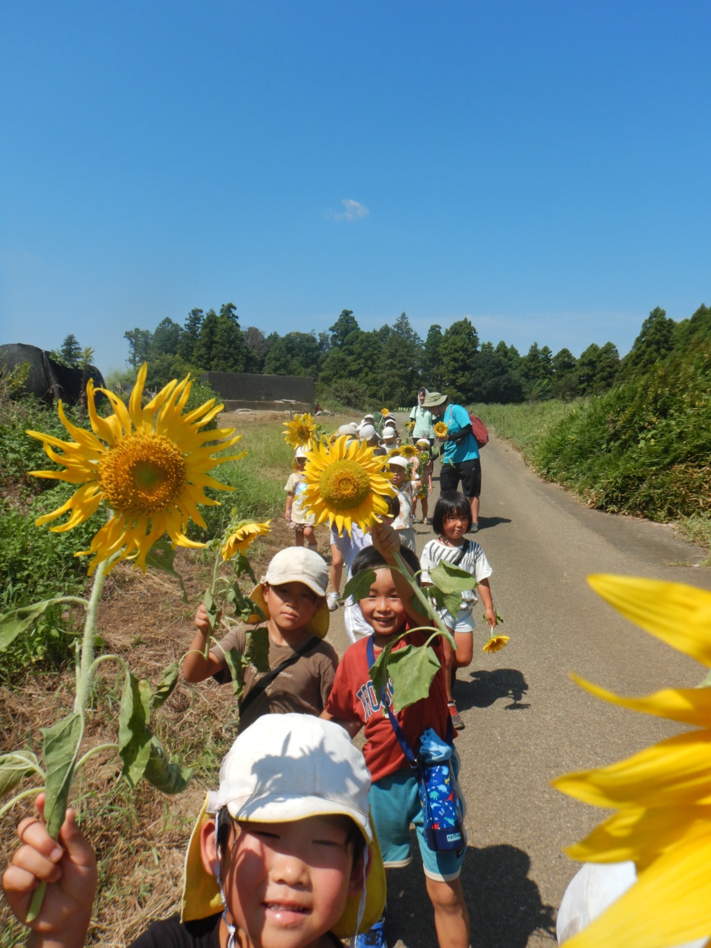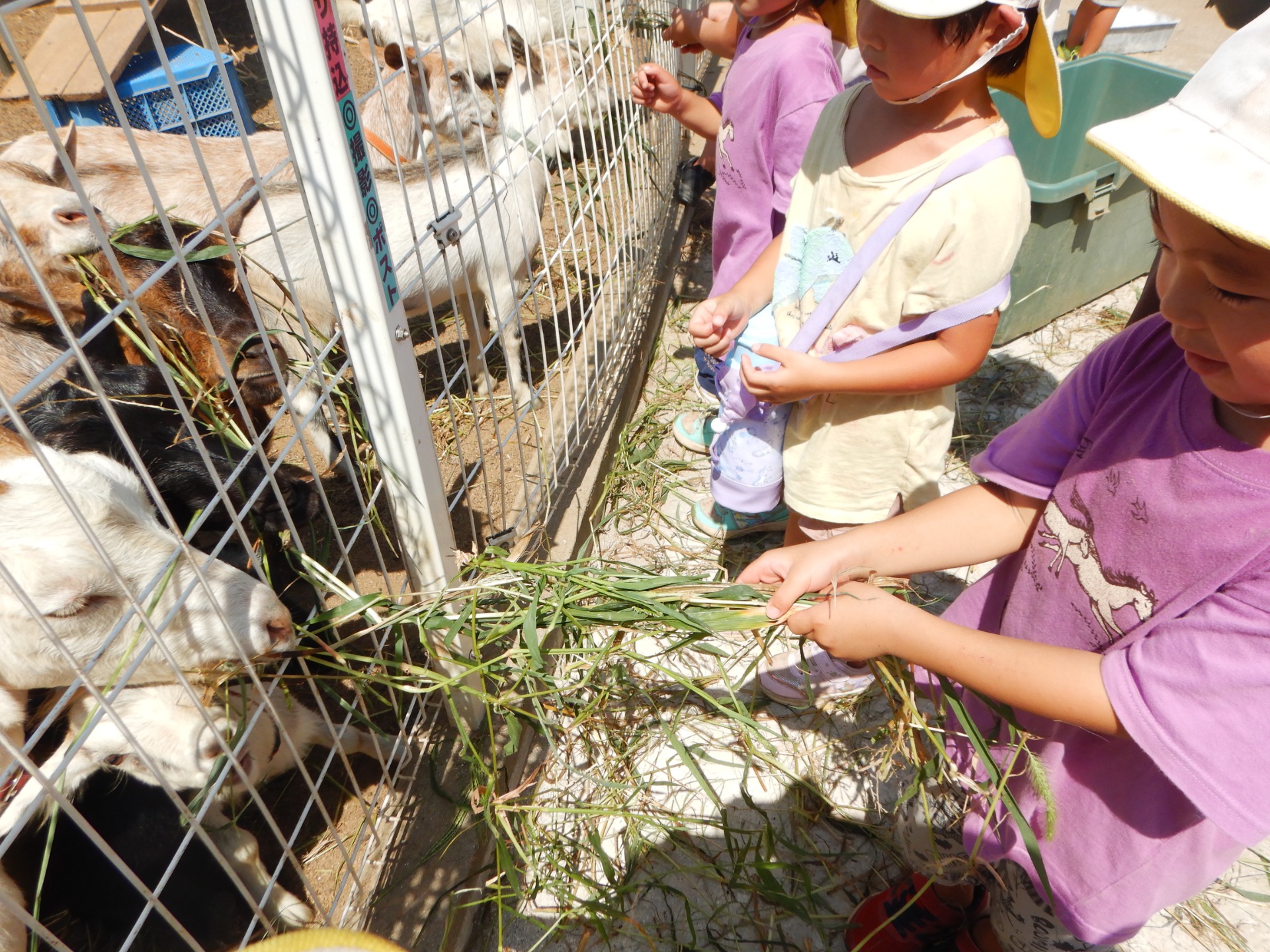 とても暑い日でしたが、梅干しを食べていざひまわり迷路へ!たくさんのひまわりの中に子どもたちの笑顔がきらきら。ひまわりのほのかに甘い香りに驚いたり、迷路の中を狼ごっこをして走り回って、最後にはひまわりのお土産まで頂きました。中根農園にはたくさんの山羊がいるので餌をあげさせてもらったりと盛りだくさんの一日でした。