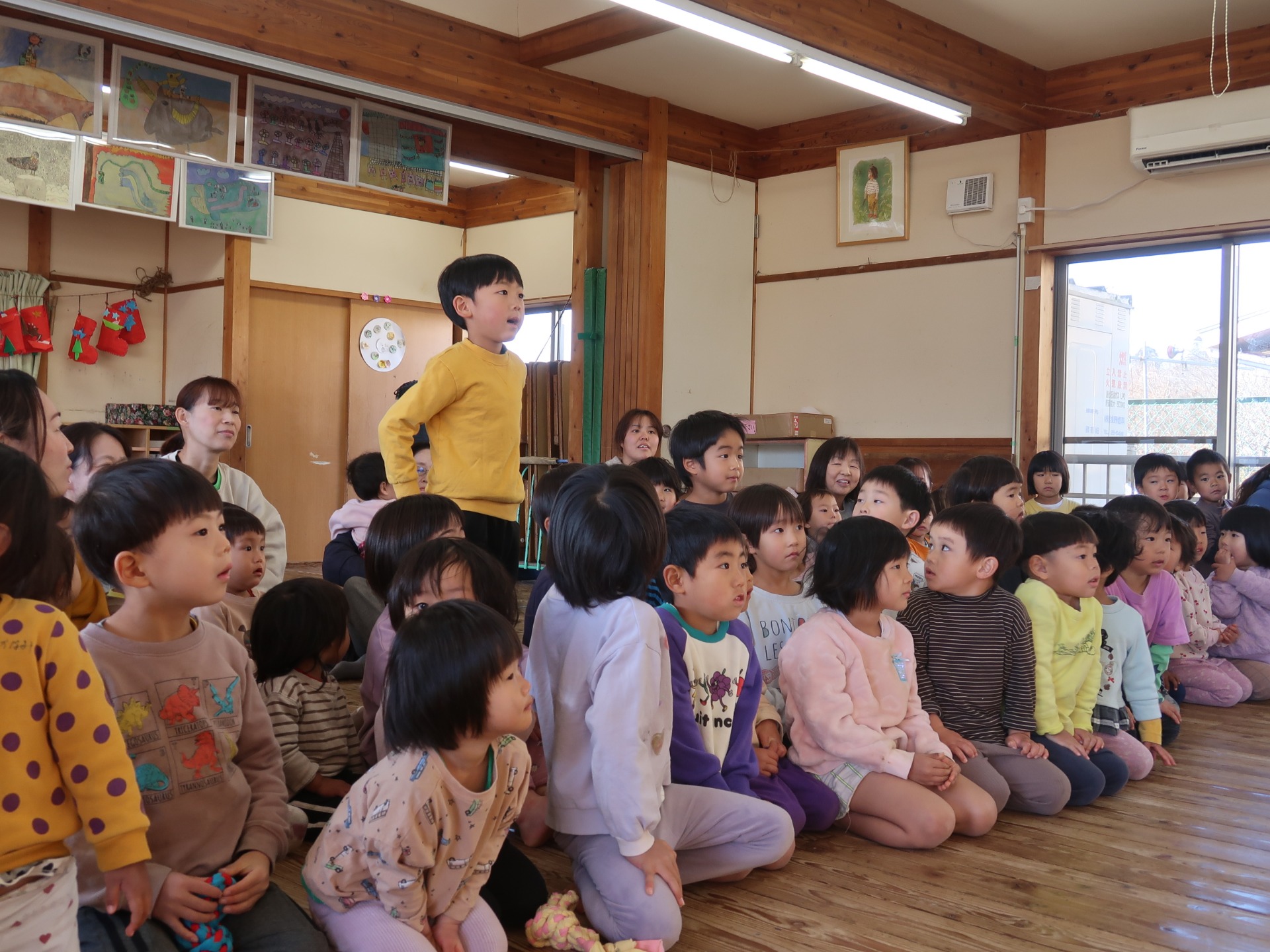 プレゼントを貰って、質問にも答えてもらって大満足のこどもたちでした。お返しに歌のプレゼントをみんなで歌いました。コーヒーでもどうですか?とお誘いしましたが、次の保育園にもプレゼントを届けに行くとのことだったので引き留められませんでした(残念)この時期忙しいんですね。お体に気をつけてまた来年も来てください!