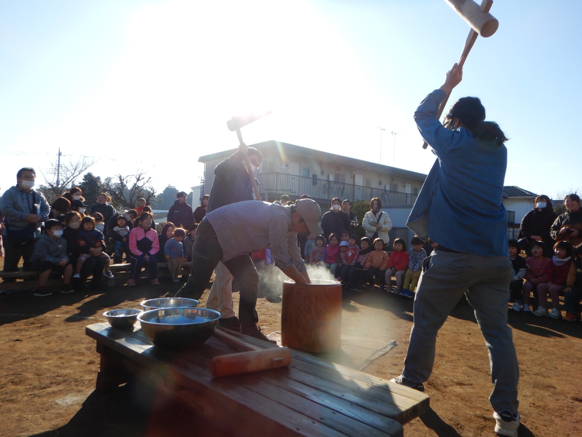 お父さんたちの力を借りて紅白のお餅をつきました。楢の木につけて五穀豊穣を願います