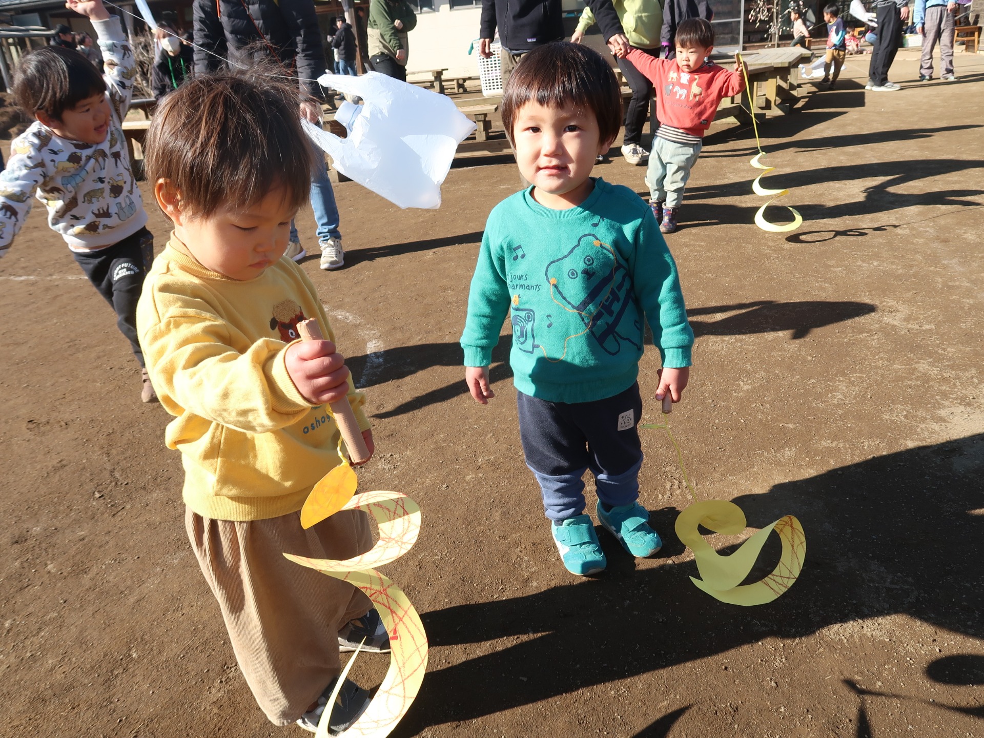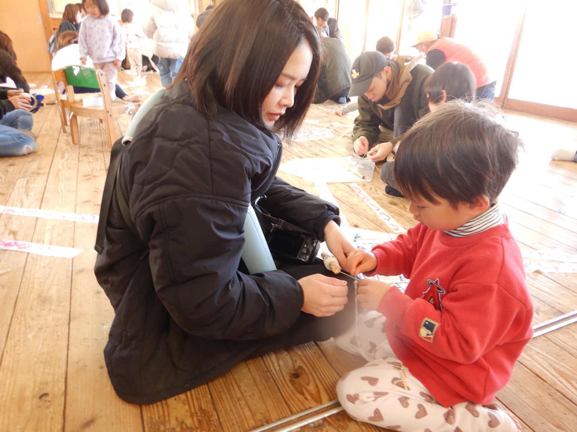 乳児はくるくる凧、幼児は六角凧をお父さんお母さんと一緒に組み立てました